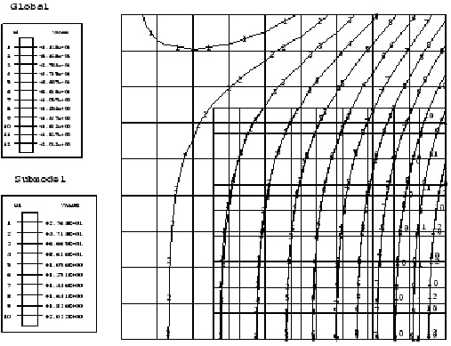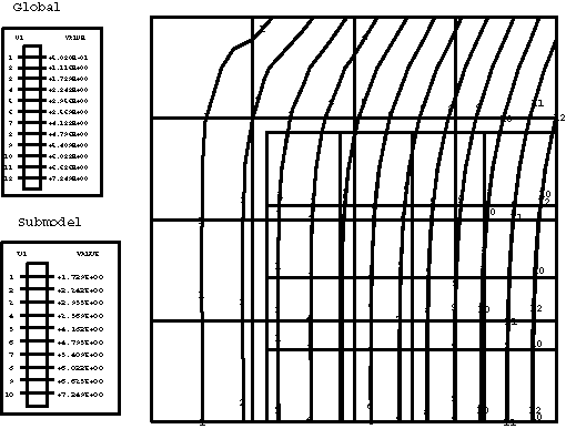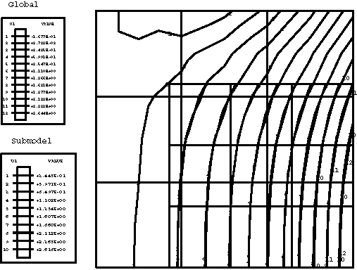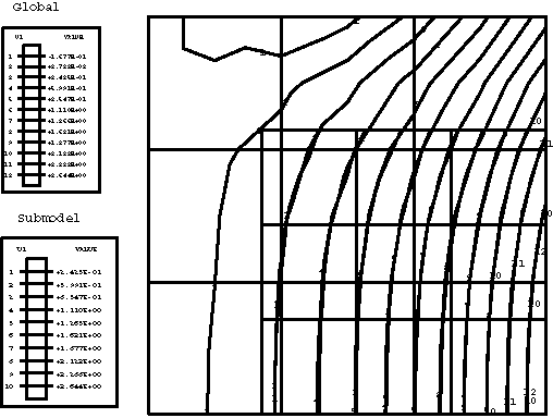 ![]() Figure 4. contours in global and submodels: 8-node plane strain.