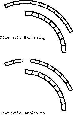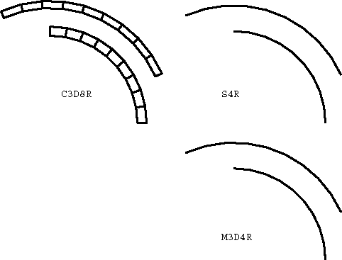 ProductsAbaqus/Explicit Elements testedCPE4R C3D8R M3D4R S4R Features testedLarge deformation kinematics, elastic-plastic material with strain hardening, user material, multi-point constraints. Problem descriptionThe rotating cylinder problem was proposed by Longcope and Key (1977) as a means of exercising finite rotation algorithms. In this problem a cylinder with an initial angular velocity of 4000 rad/sec and a zero initial stress state is modeled. (This is physically impossible because the body forces would generate a stress field under this angular velocity. Nevertheless, these initial conditions are acceptable, since this is merely a numerical experiment.) The inside of the cylinder is subjected to an instantaneous application of a pressure of 67.3 MPa (9760 psi). The elastic material properties are defined as Young's modulus of 71 GPa (1.03 × 107 psi), Poisson's ratio of 0.3333, and density of 2680 kg/m3 (2.508 × 10−4 lb sec2 in−4). An isotropic hardening plasticity model is used with an initial yield of 286 MPa (4.15 × 104 psi) and constant hardening modulus of 3.565 GPa (5.17 × 105 psi). Only one-quarter of the ring is modeled using a constraint equation and a multi-point constraint to enforce the repeated symmetry boundary condition. A local cylindrical coordinate system is defined at each material point of the mesh. Results and discussionThe first case considered is a two-dimensional model using CPE4R elements. In this case two meshes are defined in the same problem, as shown in Figure 1. The lower mesh in Figure 1 uses the built-in Mises isotropic hardening plasticity model. The upper mesh in Figure 1 employs user subroutine VUMAT with the kinematic hardening Mises model described in Models for metals subjected to cyclic loading. Figure 2 shows the time history of the maximum principal stress in the two-dimensional model for both cases. Figure 3 shows the time history of equivalent plastic strain in the two-dimensional model for both cases. Figure 4 shows the energy histories in the two-dimensional model. The energy history is particularly important in this analysis because it demonstrates that there is no energy lost in the enforcement of multi-point constraints. The second case is a three-dimensional representation of the same problem using shells, membranes, and brick elements to model the ring with suitable boundary conditions to reproduce closely the original two-dimensional model. The built-in Mises isotropic hardening plasticity model is used. The meshes for the three-dimensional case are shown in Figure 5. Figure 6 shows the time history of the maximum principal stress in the three-dimensional model for both cases. Figure 7 shows the time history of the equivalent plastic strain in the three-dimensional model for both cases. Figure 8 shows the energy histories in the three-dimensional model. Note that each energy quantity is summed over the two cases. The results compare well with those obtained by Longcope and Key (1977). Input files